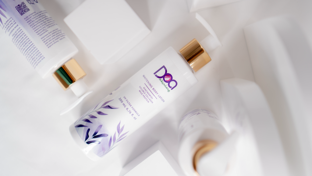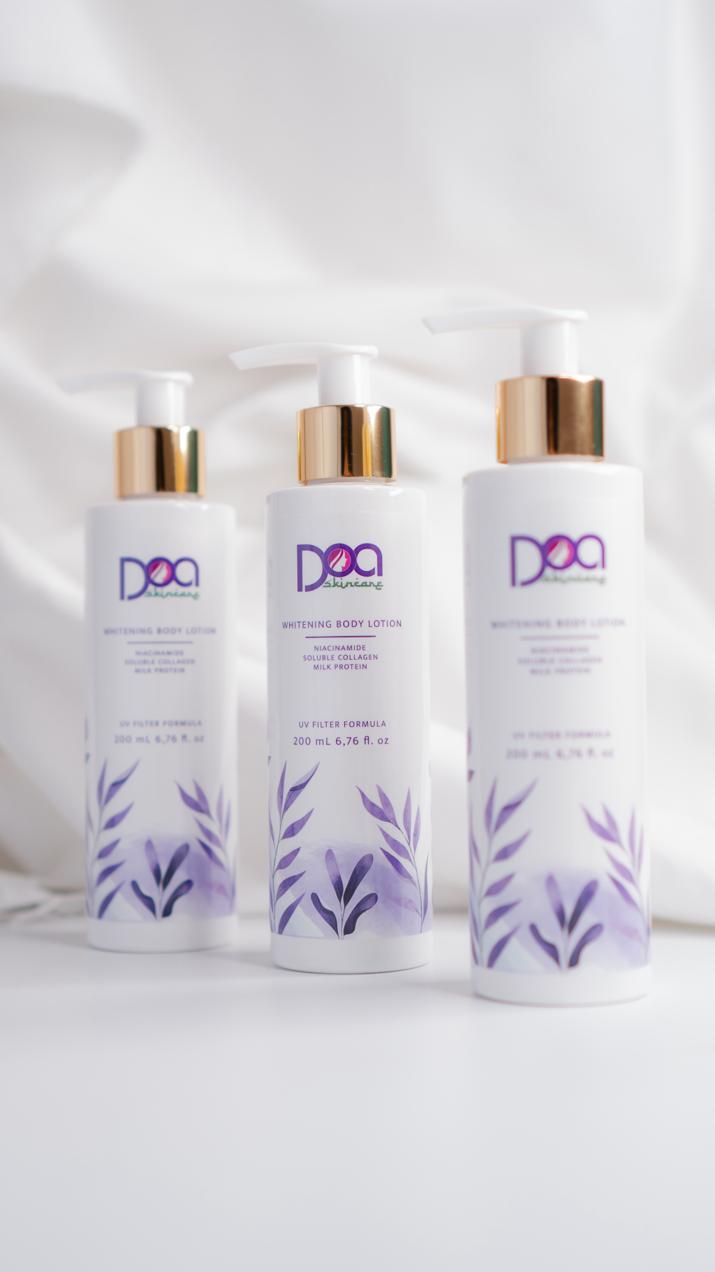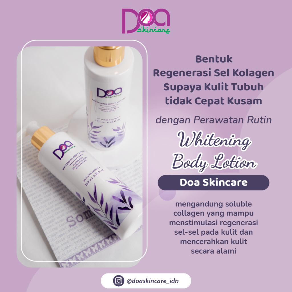 Doa Skincare Whitening Body Lotion dengan kandungan Niacinimide, Soluble Collagen, Milk Protein, dan dengan aroma yang menyegarkan diformulasikan untuk mencerahkan kulit secara merata, merawat, menutrisi kulit & membantu menyamarkan bekas luka, Serta melindungi kulit dari paparan sinar matahari.