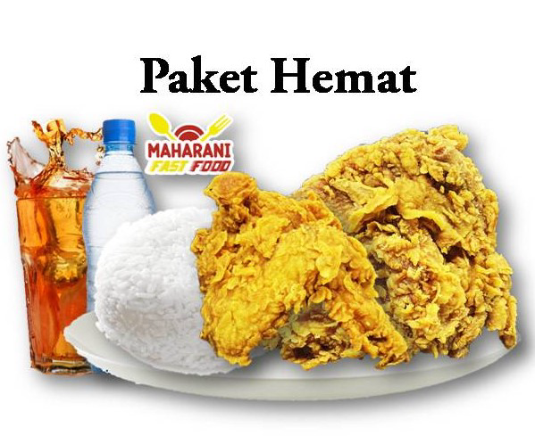 Menu Paket Hemat, berisi Nasi Putih, Ayam, dan Minuman kemasan Pilihan bagian ayam: terdapat Paha atas, Dada, Paha bawah dan Sayap dengan Harga Mulai Rp.13.000,-